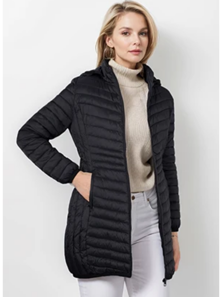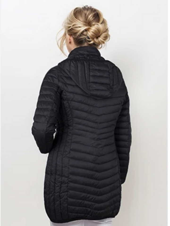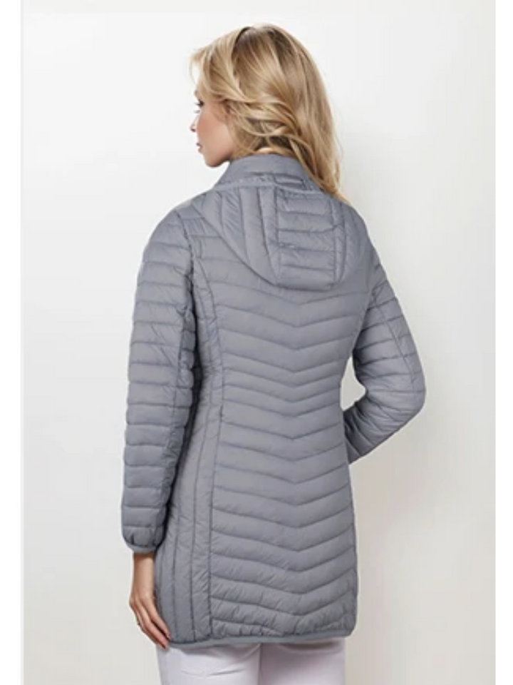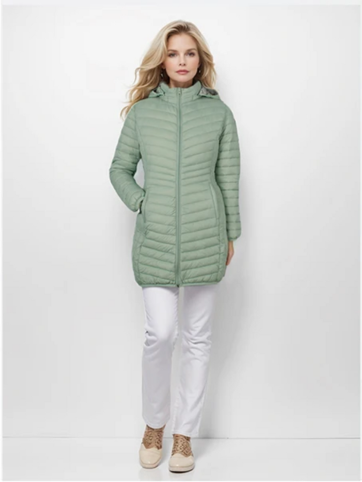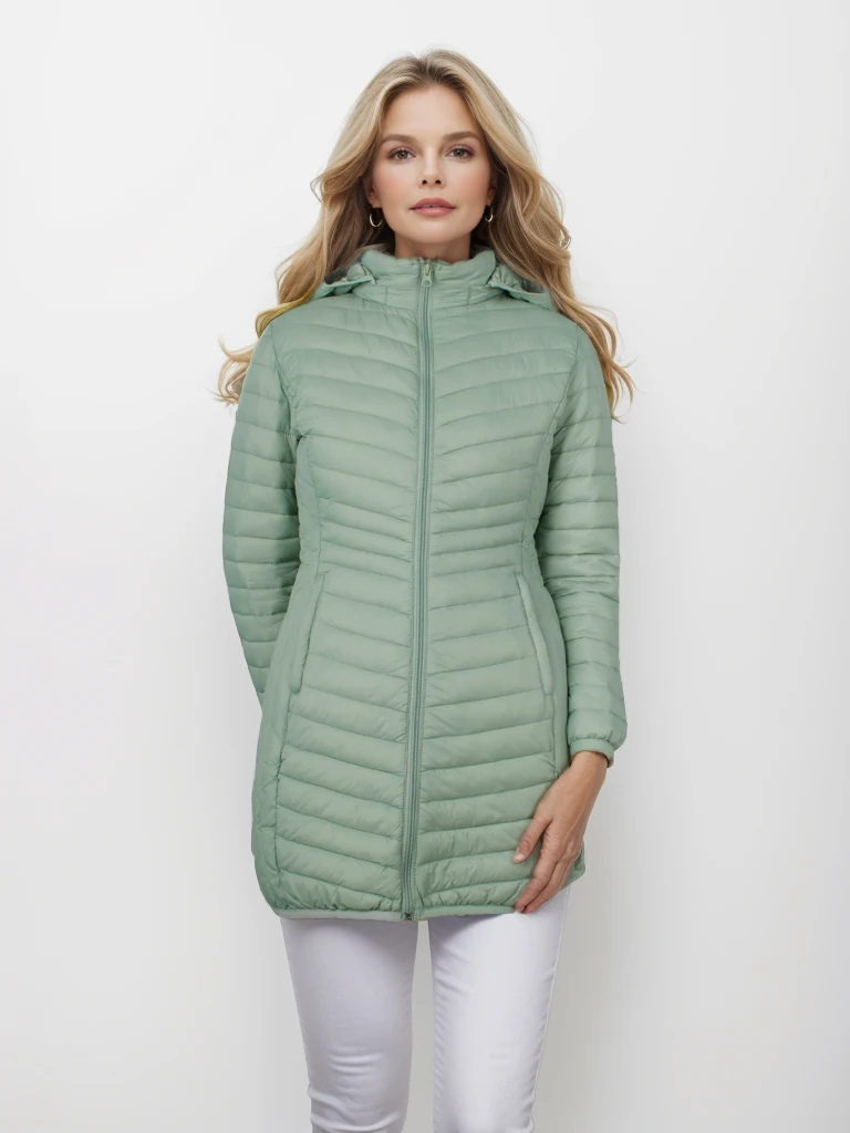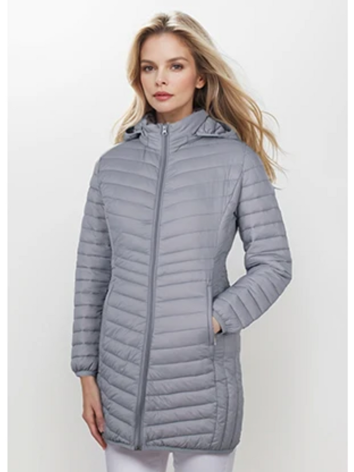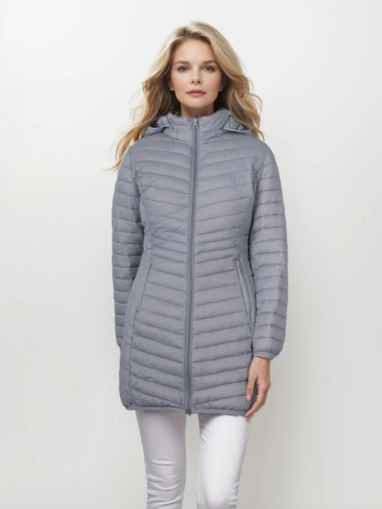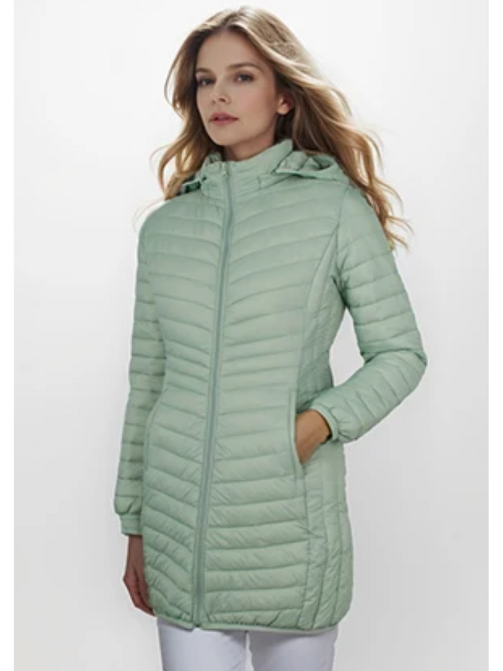 Ervaar de perfecte combinatie van elegantie en comfort met ons dames donsjack, lichtgewicht en voorzien van een capuchon. Dit stijlvolle donsjack biedt een lange pasvorm die zowel elegant als praktisch is. Het lichte materiaal zorgt voor uitstekende isolatie zonder zwaar te zijn, terwijl de capuchon extra bescherming biedt tegen het weer.