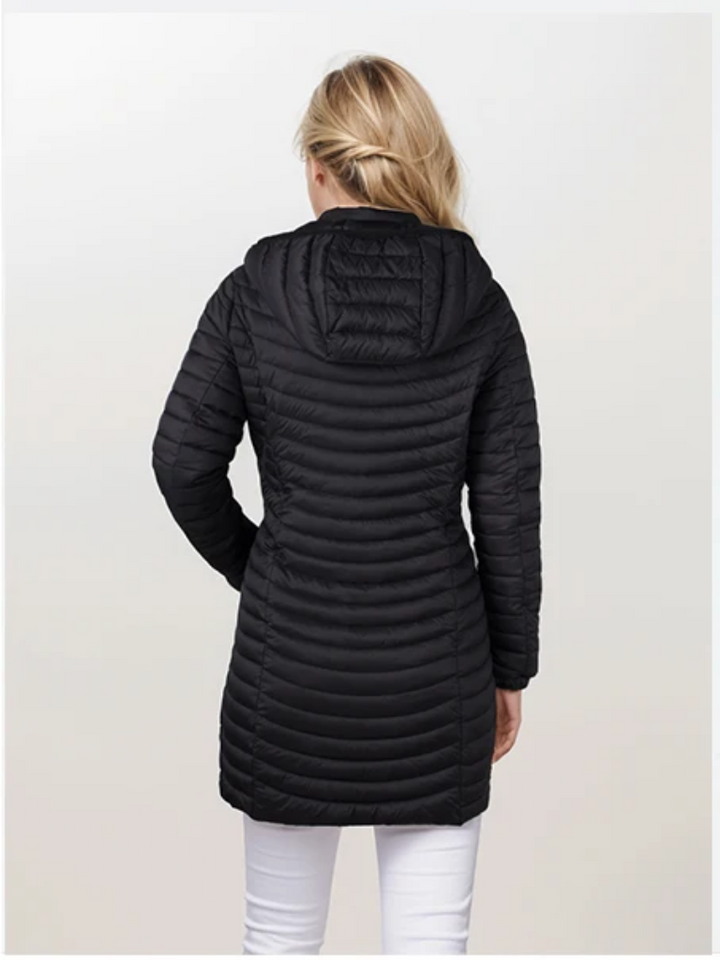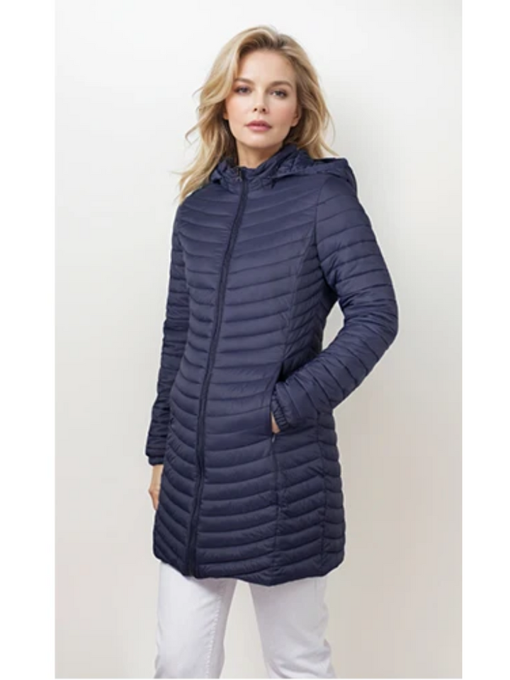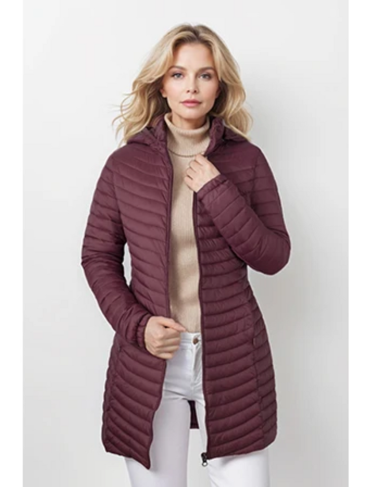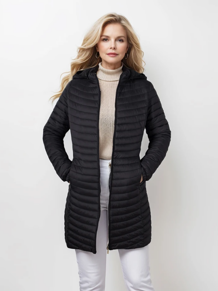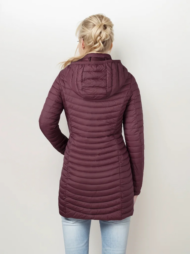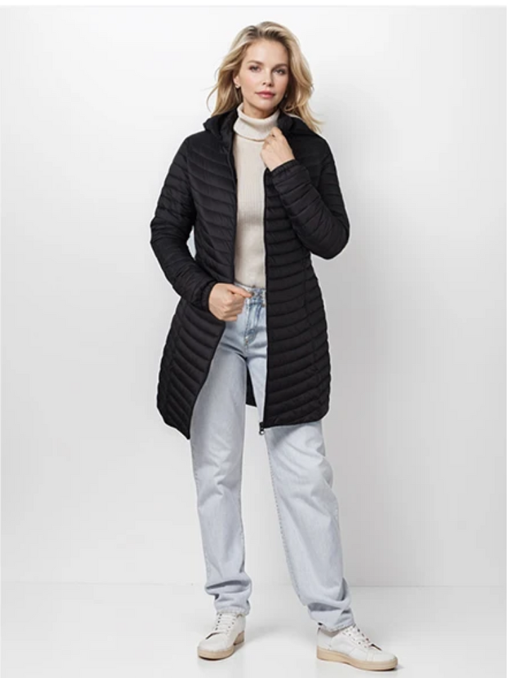 Ervaar de ultieme combinatie van elegantie en comfort met de Alena lange donsjas met capuchon. Deze lichtgewicht donsjas biedt een verfijnde uitstraling met zijn lange snit en comfortabele pasvorm. De elegante kraag voegt een extra dimensie van stijl toe, terwijl de lichtgewicht vulling je warm houdt zonder in te boeten op draaggemak. Ideaal voor elke gelegenheid, van casual tot chic.