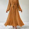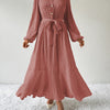 Elegant Boho-Design: De lange mouwen en strikceintuur geven deze maxi jurk een trendy bohemian uitstraling, perfect voor elke gelegenheid.