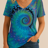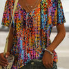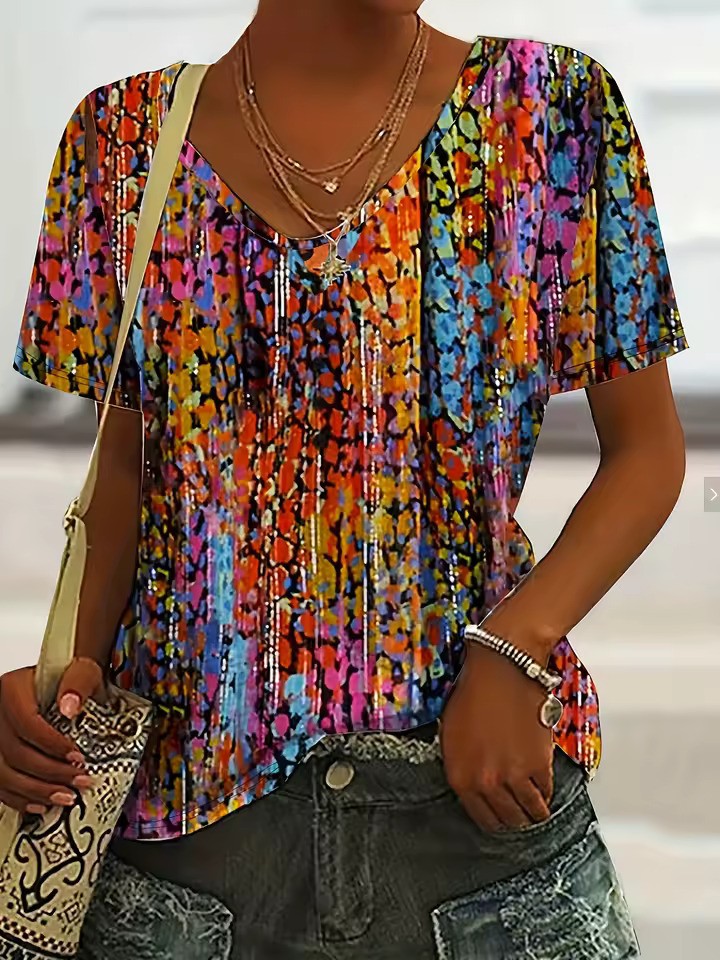 Gemaakt van zacht polyester met lichte stretch, voelt deze top soepel aan en beweegt hij makkelijk met je mee. De V-hals en korte mouwen geven een flatterende pasvorm, terwijl de opvallende print zorgt voor een onderscheidende look. Ideaal voor een casual dag of een weekenduitje.