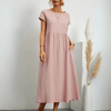 Met zijn klassieke O-hals, korte mouwen en natuurlijke taille combineert deze pulloverjurk tijdloze stijl met casual gemak – perfect voor vakanties, weekenduitjes of gewoon om te genieten van warme, zonnige dagen. Het effen ontwerp en de subtiele plooidetails maken hem gemakkelijk om zowel formeel als casual te dragen, afhankelijk van de gelegenheid.