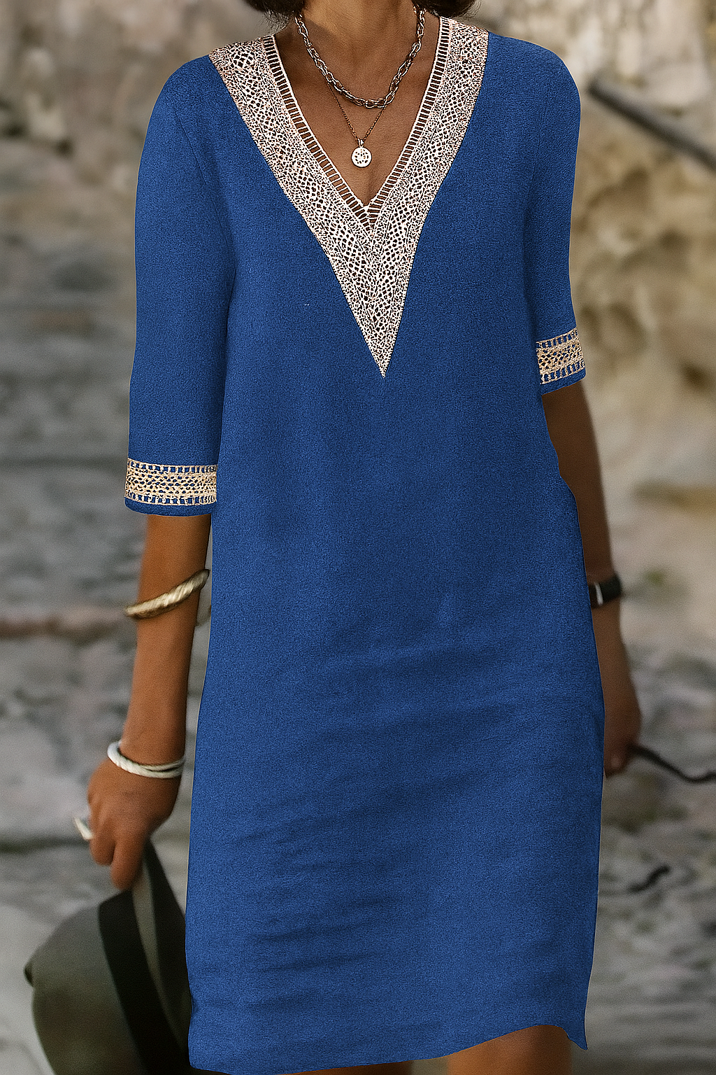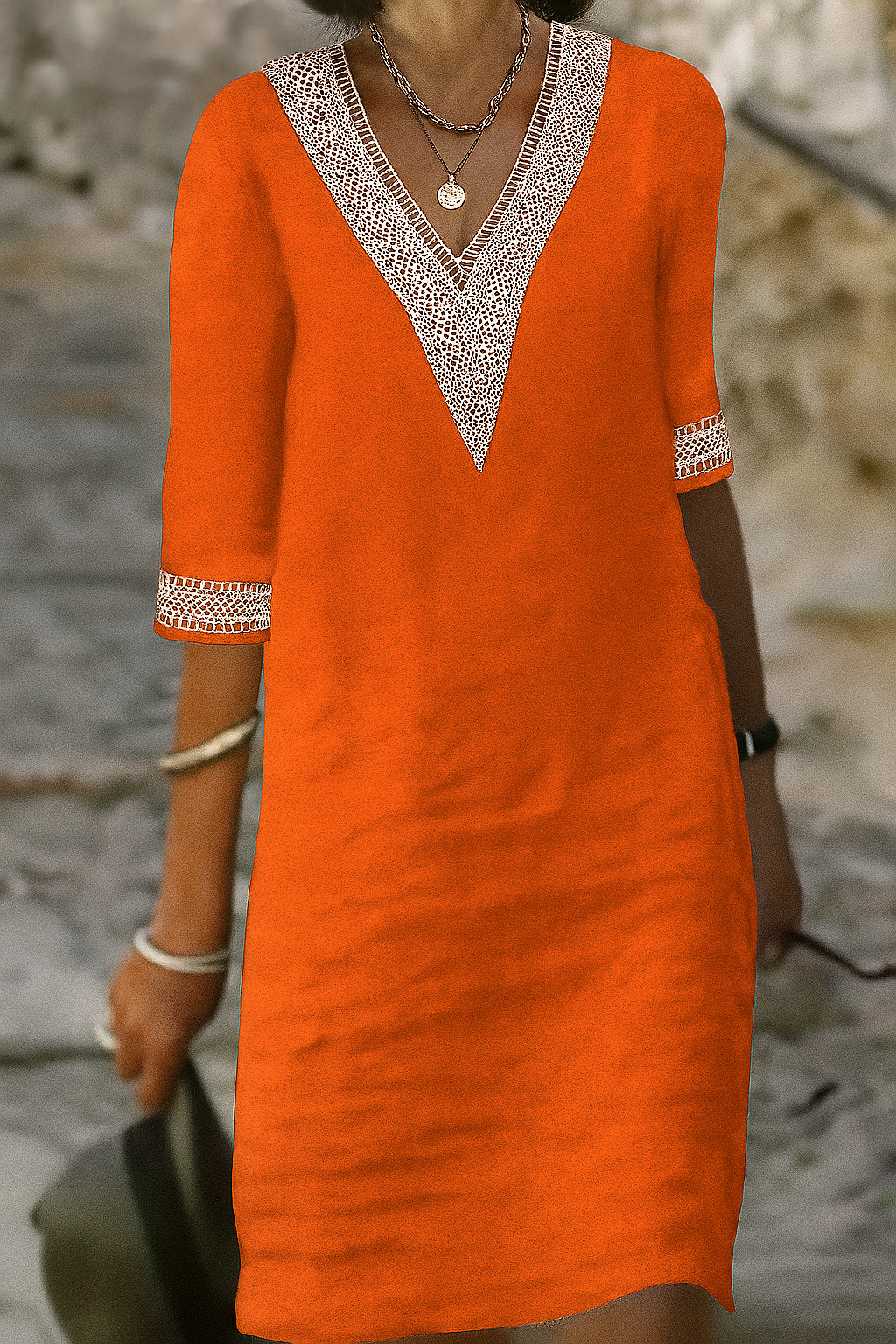Voeg een vleugje retro charme toe aan je garderobe met deze mini-jurk met V-hals van een katoen-linnenmix – de perfecte mix van casual comfort en vrouwelijke elegantie. Deze jurk tot boven de knie heeft een losse taille en een flatterend A-lijn silhouet, sierlijke uitlopende mouwen en delicate kanten details voor een vintage-geïnspireerde look. De ademende stof en pulloverstijl maken hem ideaal voor warme dagen of als laagjesoutfit bij kouder weer.